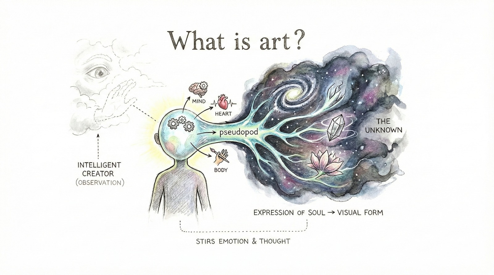 Another interpretation of what art is from a Canadian Psychologist Jordan Peterson who once said about art: “You can interpret it, and that’s helpful sometimes, just like movie criticism is helpful, but the dream is something that extends you beyond where you already are. That’s why it isn’t verbal thought, it’s something else. It’s like a pseudopod that’s going out into the unknown. That’s what art is”. And that's the big thought here that art art creates something new from the unknown from the subconscious from the things we don't see and brings it to the fore. And why does it stir emotion? And why does it stir thought?